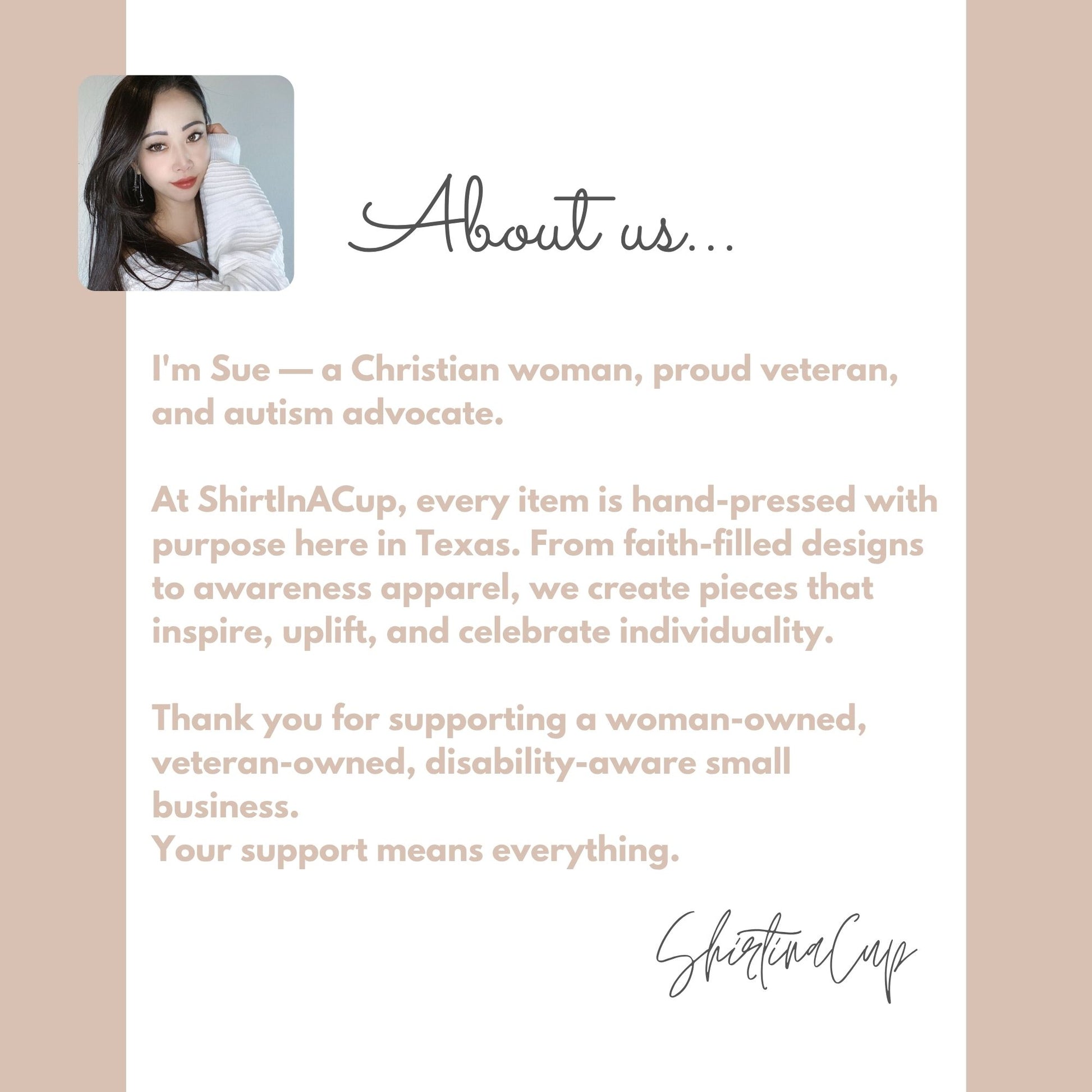 More colors available—email shirtinacup@gmail.com for custom color requests. Each shirt is hand-pressed and ships quickly from Texas.