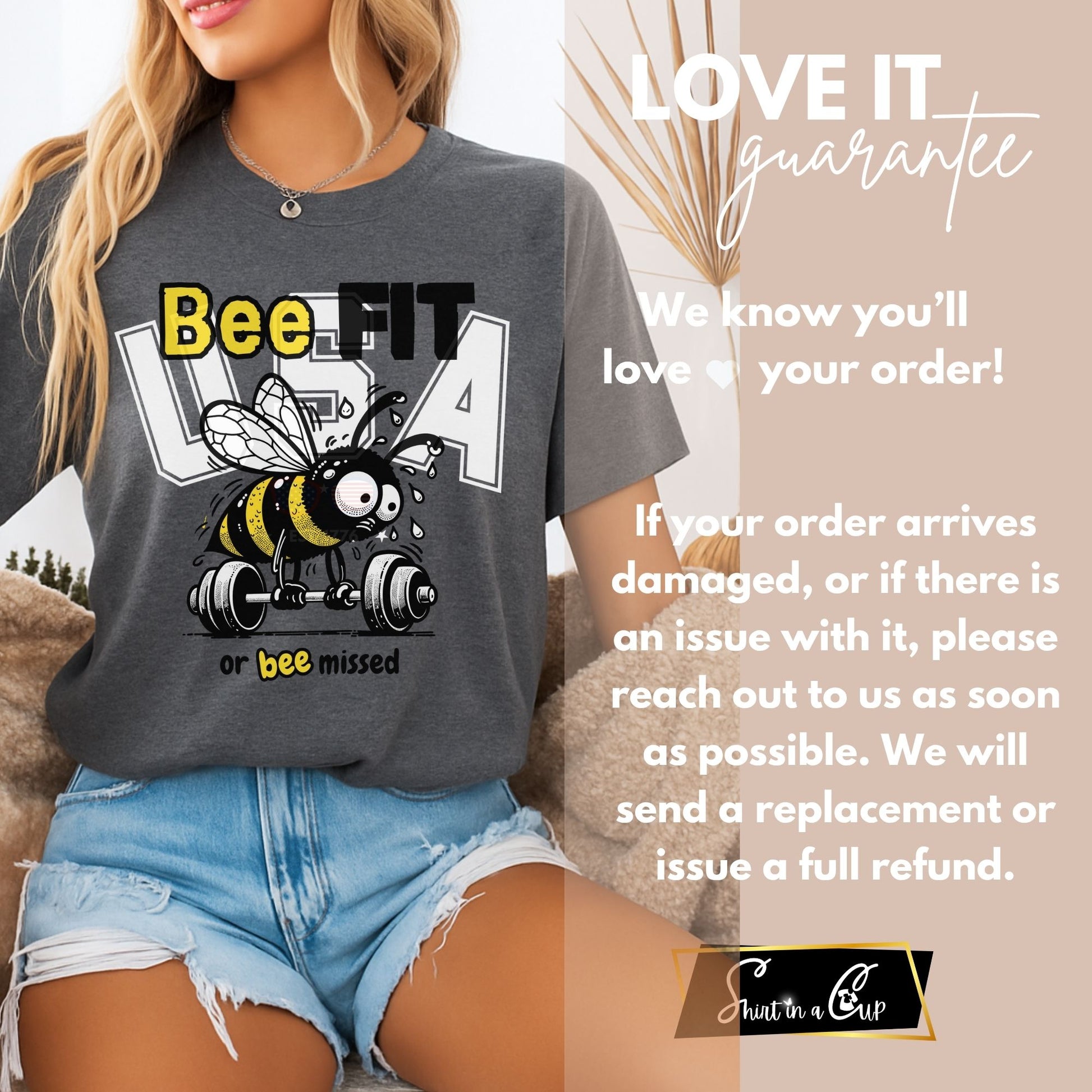 Bee FIT or bee missed! This hand-drawn bee lifting weights is perfect for gym days, fitness fans, or anyone who loves a good pun. Printed on soft, high-quality Bella+Canvas 3001 shirts, this tee is breathable, comfy, and made to last.