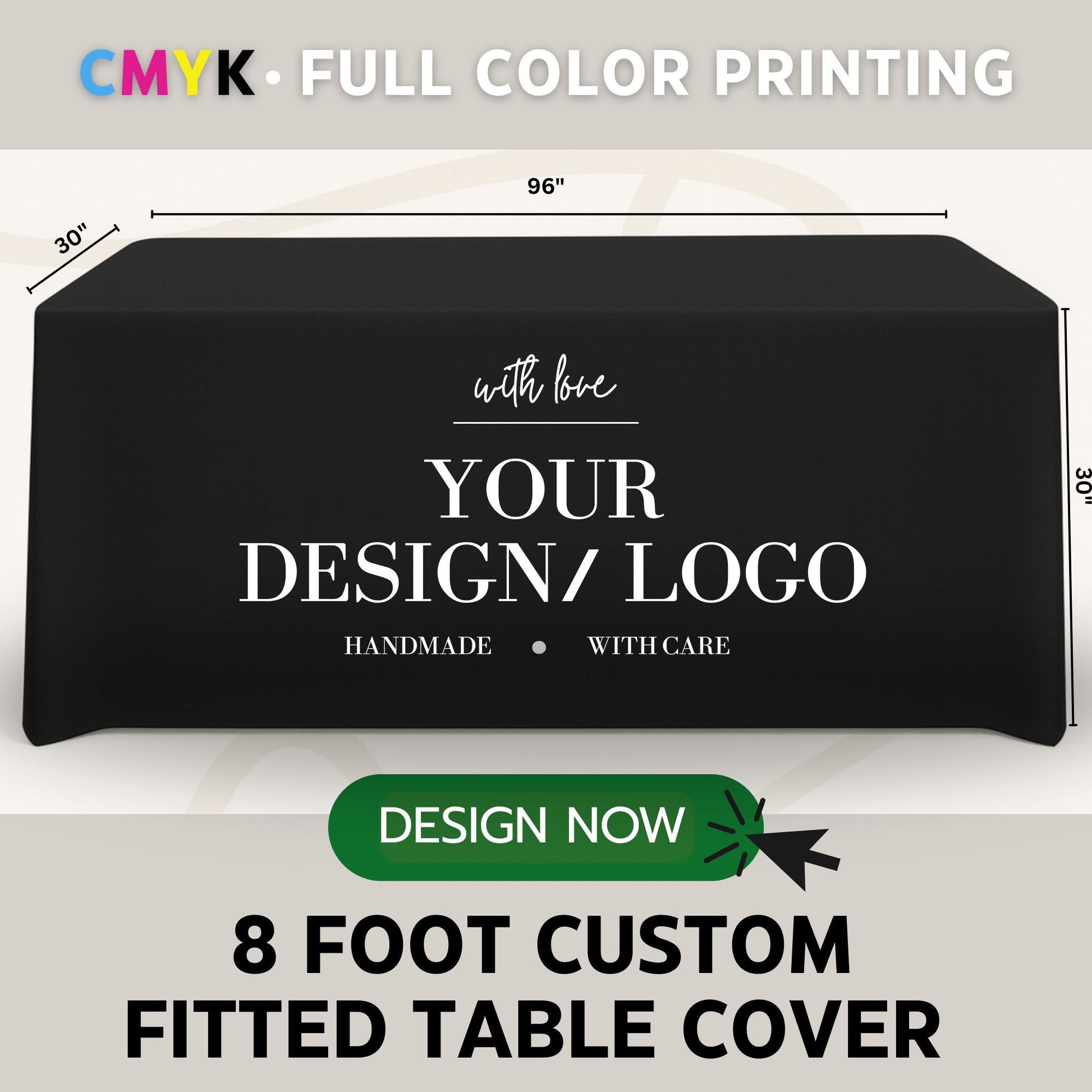 Custom 8ft Fitted Tablecloth with Logo: Waterproof Polyester Event Table Cover