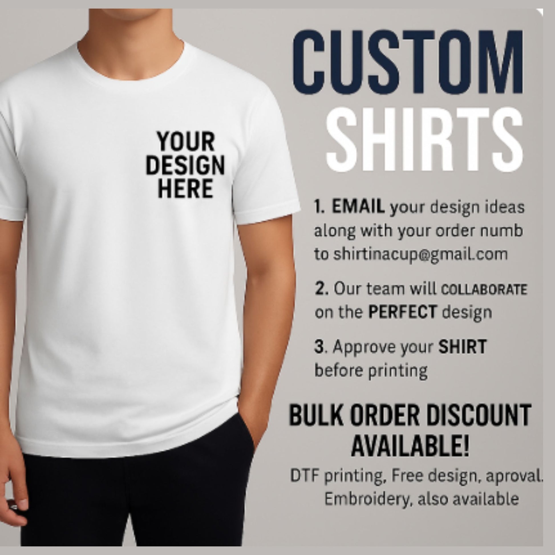 Email: Send your design ideas, photos, or special requests along with your order number to shirtinacup@gmail.com