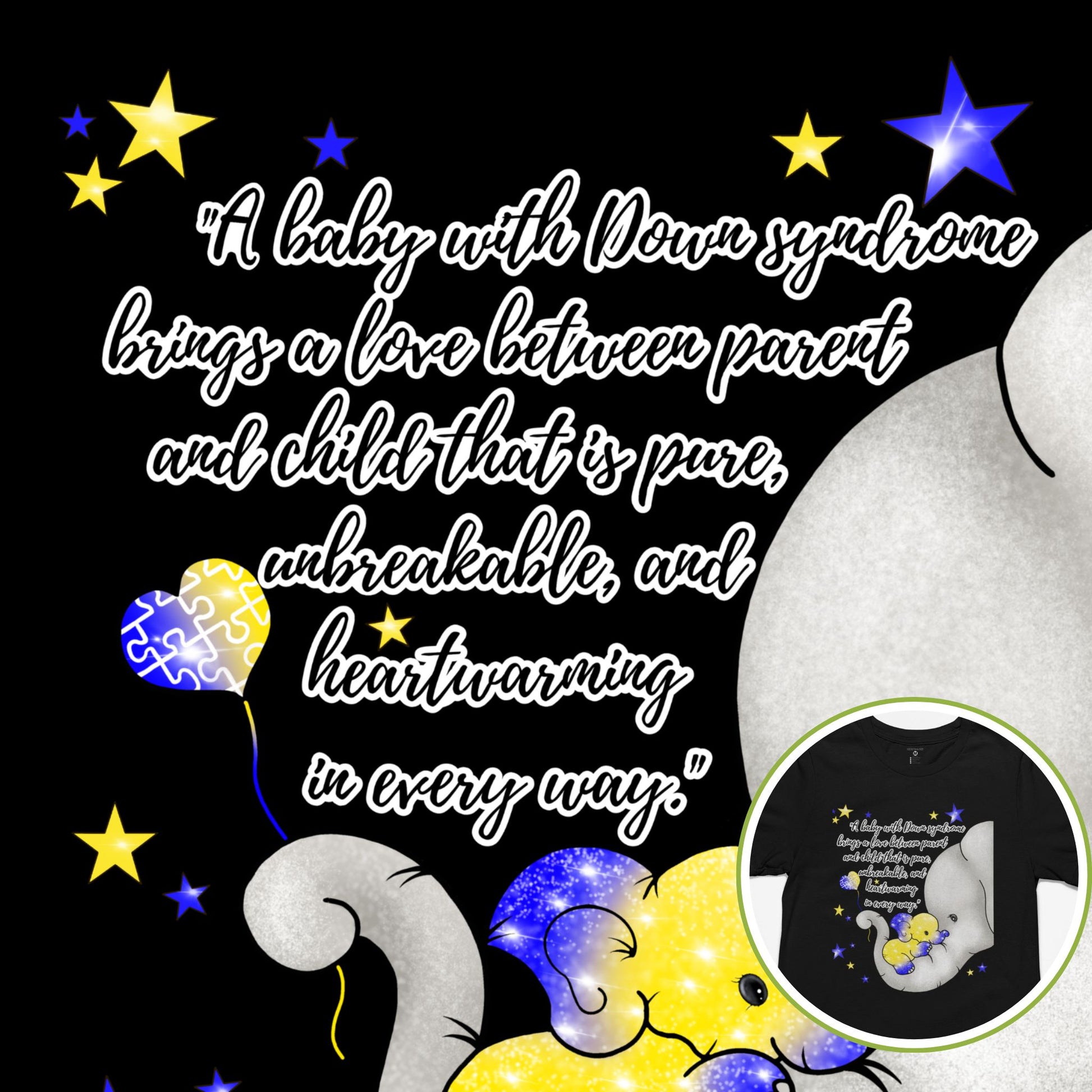 This heartfelt design celebrates the unbreakable bond between parent and child. Featuring an exclusive hand-drawn elephant cuddling a baby elephant in Down Syndrome awareness colors, this tee is a beautiful reminder of love, strength, and hope.