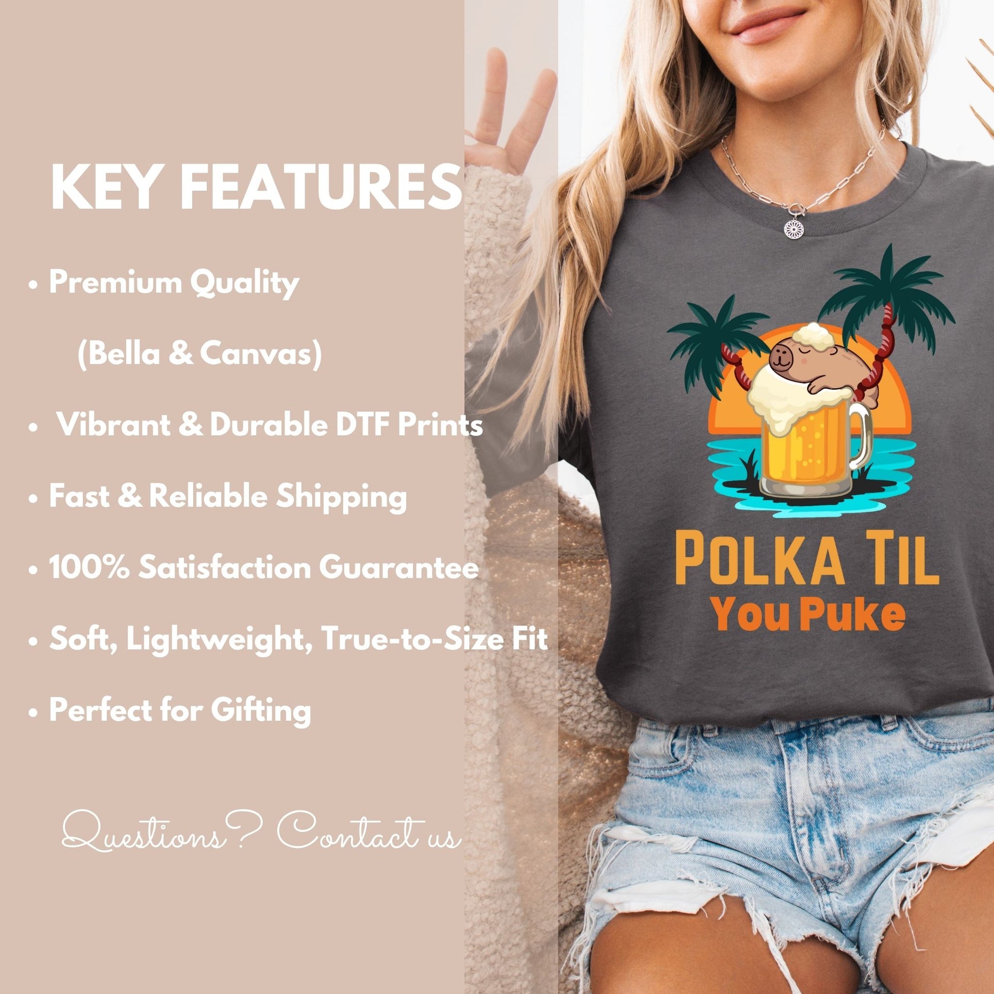 Get ready to turn heads this Oktoberfest with our hilarious “Polka Til You Puke” shirt! Featuring a laid-back sloth lounging in a frothy beer mug between two palm trees with a golden sunset backdrop, this design captures party vibes and festival energy all in one. Whether you're hitting the dance floor, sipping brews at the biergarten, or just living your best sloth life, this tee is a guaranteed conversation starter. Printed on soft, high-quality Bella + Canvas 3001 shirts and available in two top-selling colors: classic black and festive orange. Hand-pressed and shipped from Texas with care. For color inquiries or custom group orders, email ShirtinaCup@gmail.com.