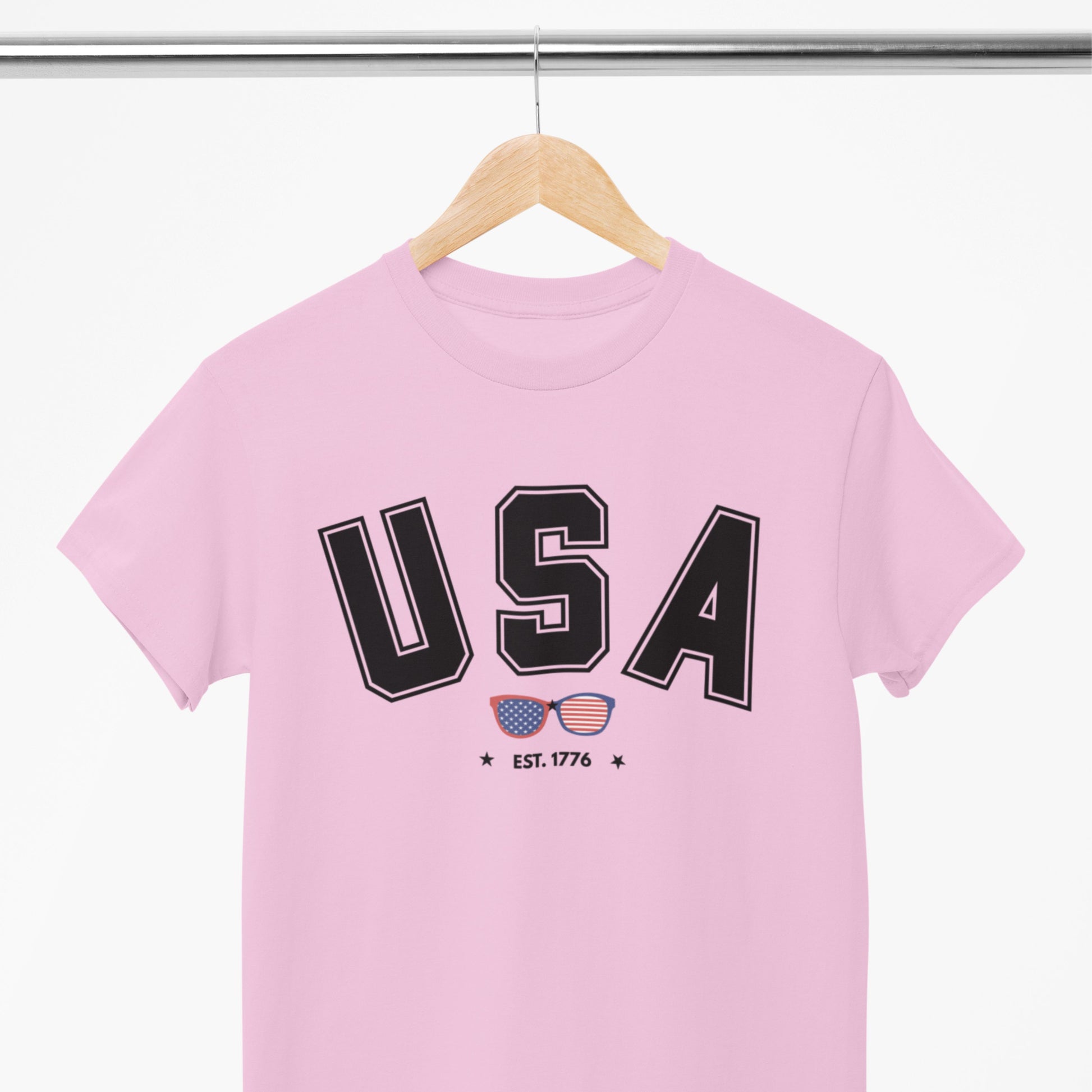 Show off your American pride with this bold, varsity-style USA tee featuring retro flag shades and a clean collegiate design — perfect for 4th of July BBQs, fireworks, or just kicking back all summer long.