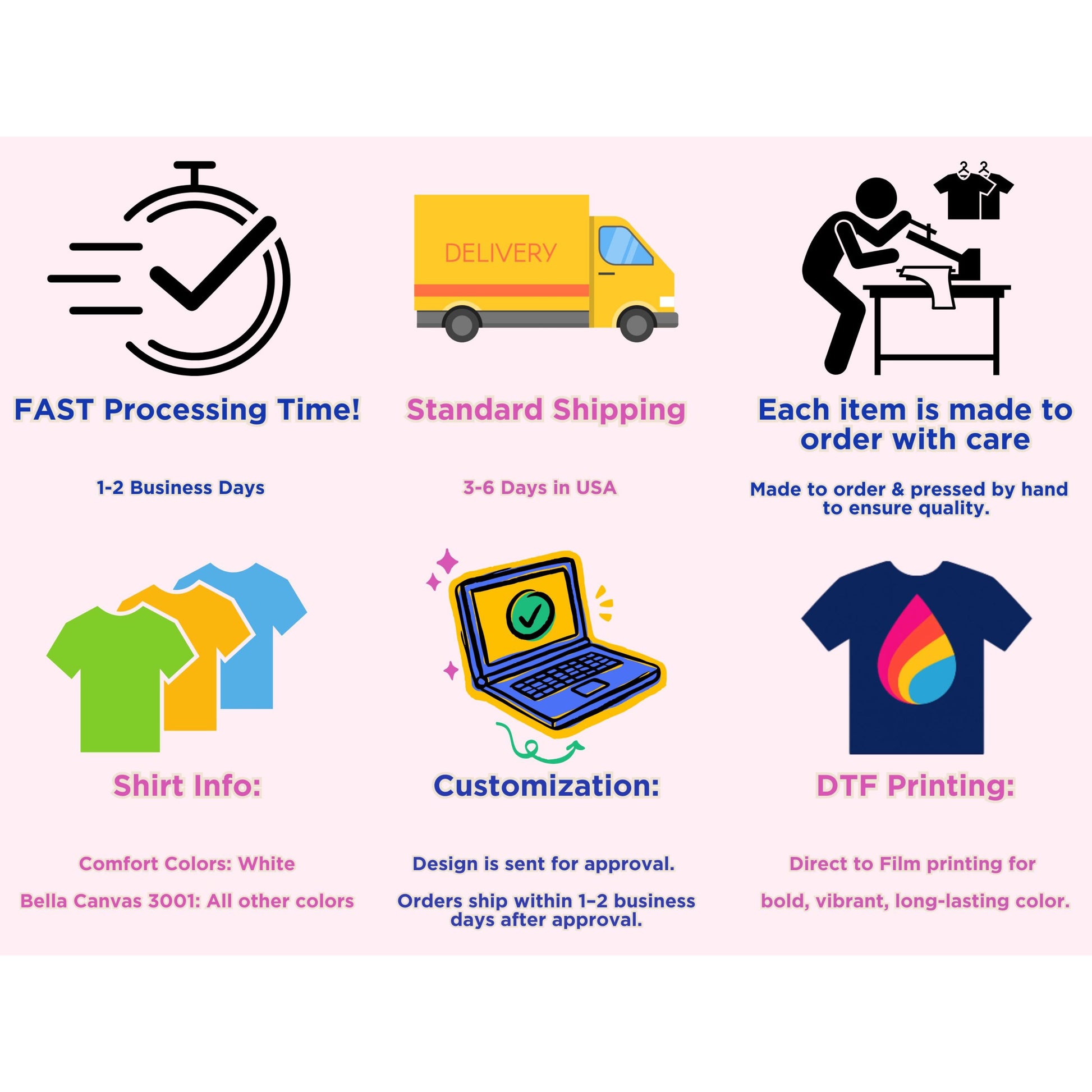 This shirt is unisex and has a soft, breathable cotton feel. White shirts are printed on Comfort Colors, while all other colors use the super-soft Bella+Canvas 3001. Each shirt is direct-to-film printed by hand, made to order in Texas for long-lasting, vibrant color.